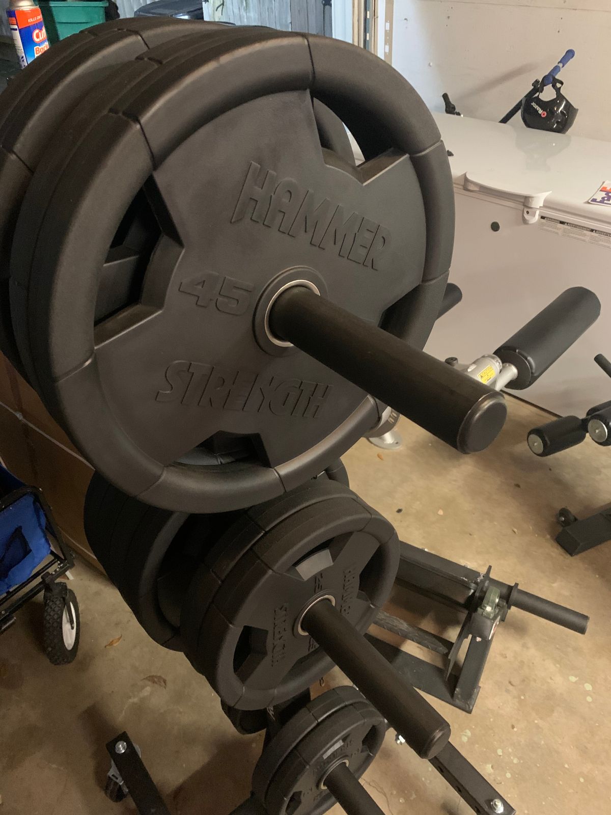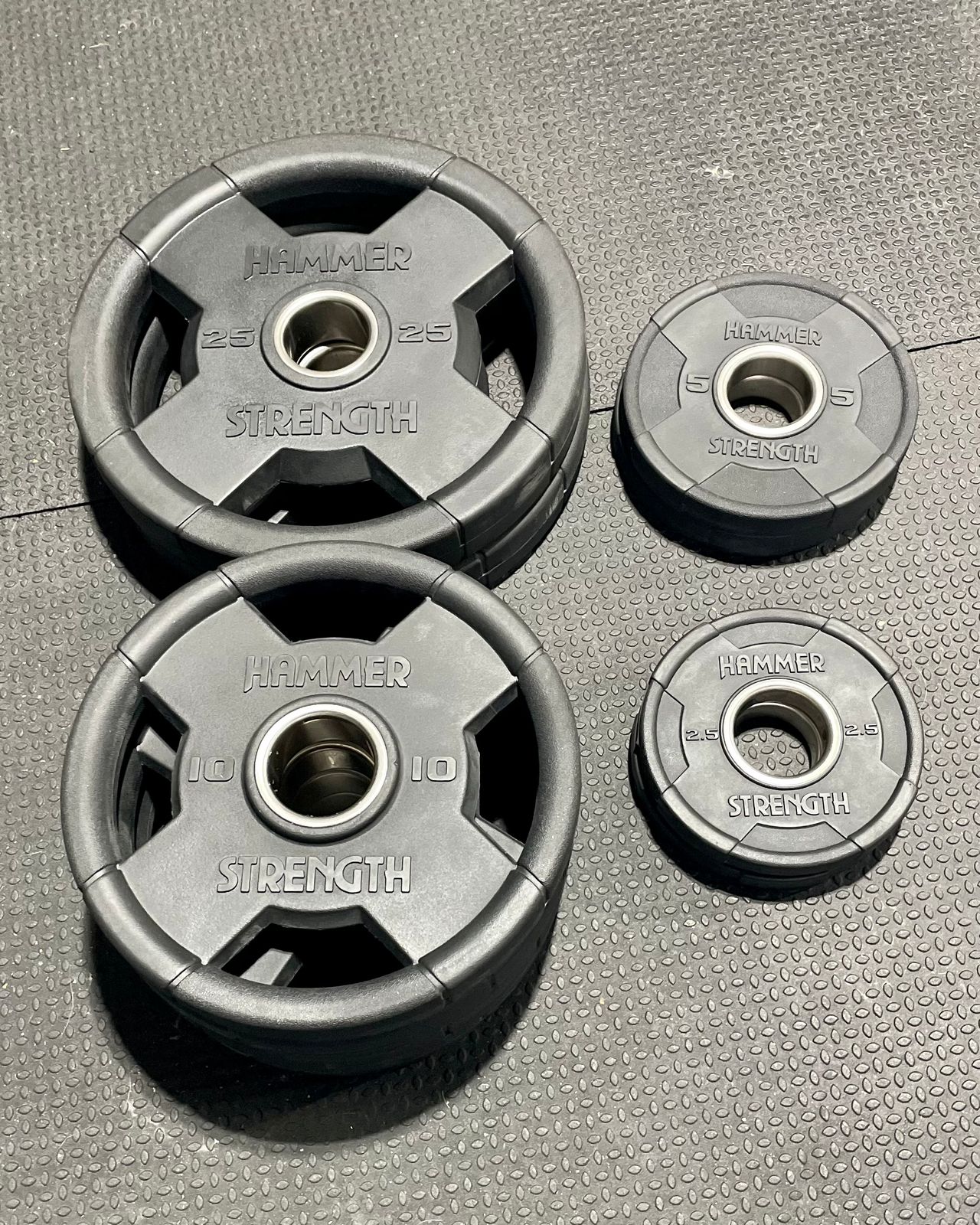 Great quality at a great value. These durable overmolded rubber Olympic plates have four open, rough-textured handles. Handles are ergonomically designed to allow for easy pickup, storage and loading when your workout is complete. The stainless steel center ring provides a durable wear surface between the plate and the bar. Currently available in multiple weights for various fitness levels.